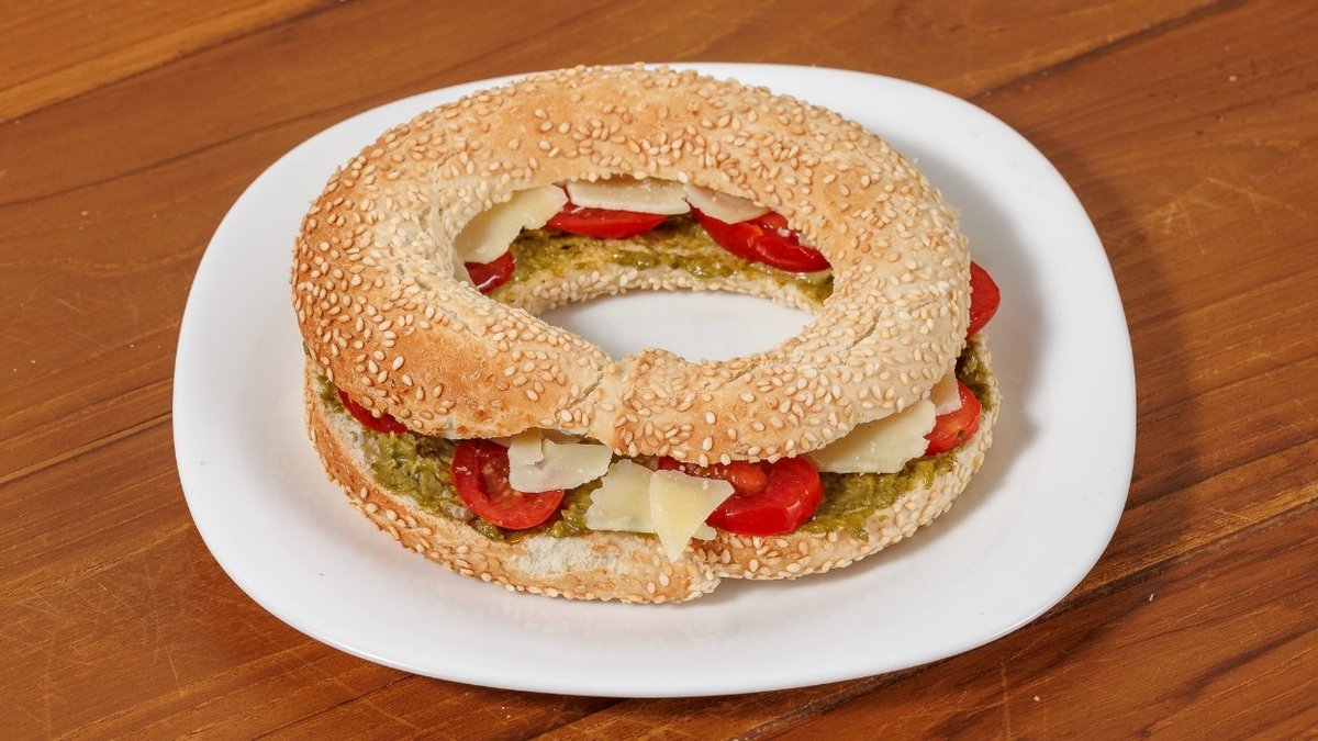 Κουλούρι Θεσσαλονίκης με πέστο βασιλικού ,ντοματίνια και flakes παρμεζάνας