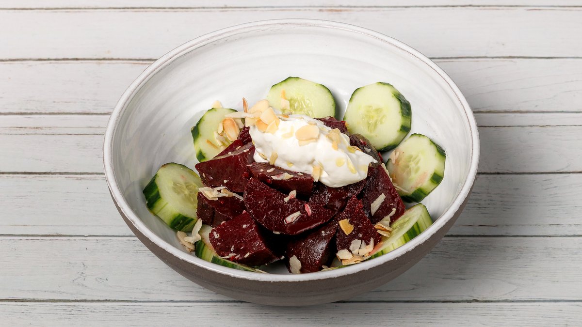 Σαλάτα με πατζάρι,αγγούρι,γιαούρτι,μέλι,λαδόξυδο,σκορδόλαδο και φιλέ αμυγδάλου