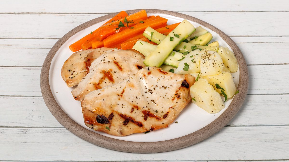 Φιλέτο κοτόπουλο σχάρας με βραστά λαχανικά. (400γρ) Ενέργεια : 410 kcal Πρωτέινη : 65.4 gr Υδατάνθρακες : 14.2 gr Λιπαρά : 8.2 gr