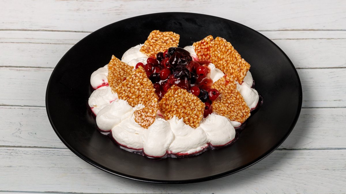 Μους γιαουρτιού με παστέλι και φρούτα του δάσους