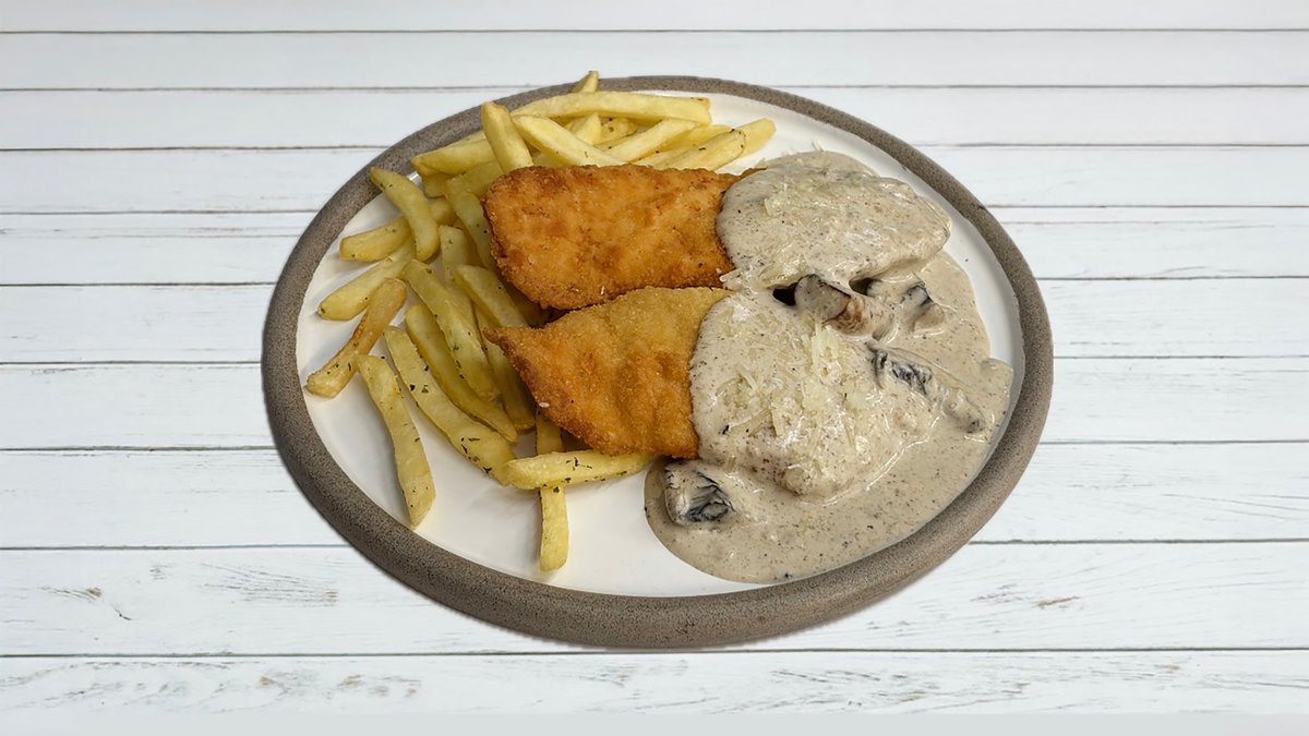 Σνίτσελ κοτόπουλο με σως μανιταριών.Συνοδεύεται από γαρνιτούρα της επιλογής σας.