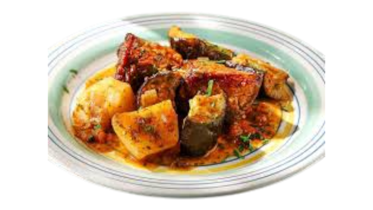 Τρυφερό μοσχαράκι κομμένο σε μικρά κομμάτια μαγειρεμένο σε σάλτσα ντομάτας.