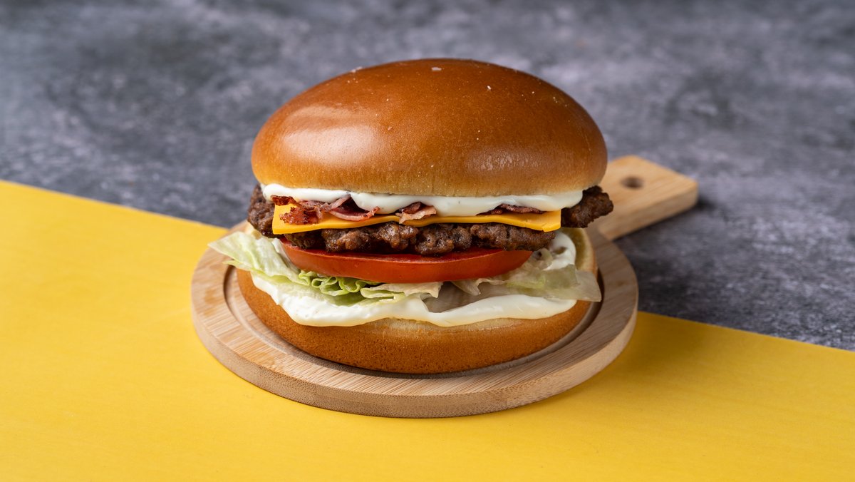 Αφράτο brioche ψωμάκι με ένα smashed burger, τραγανό iceberg, ντομάτα, cheddar, μπέικον και aioli sauce