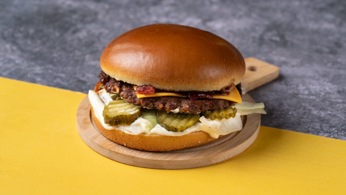 Αφράτο brioche ψωμάκι με ένα smashed burger, τραγανό iceberg, cheddar, μπέικον, πίκλες, μαγιονέζα και bbq sauce