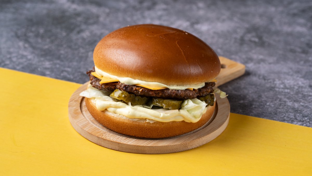 Αφράτο brioche ψωμάκι με ένα smashed burger, τραγανό iceberg, κέτσαπ, μουστάρδα και αγγουρομαγιονέζα