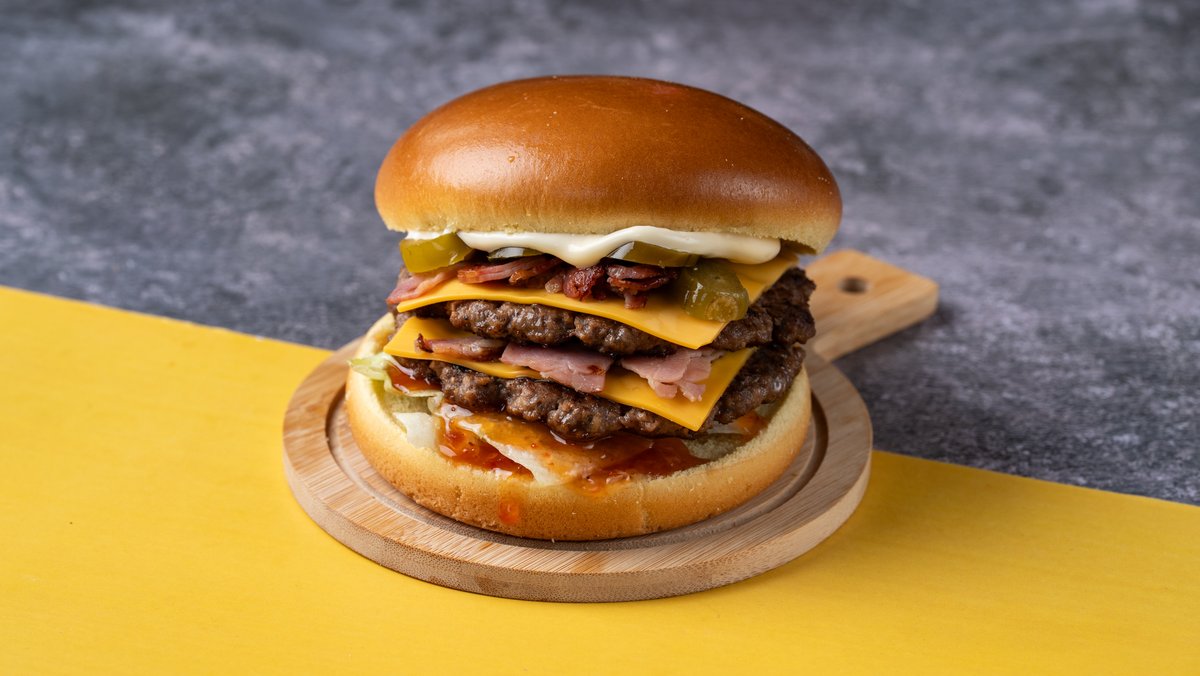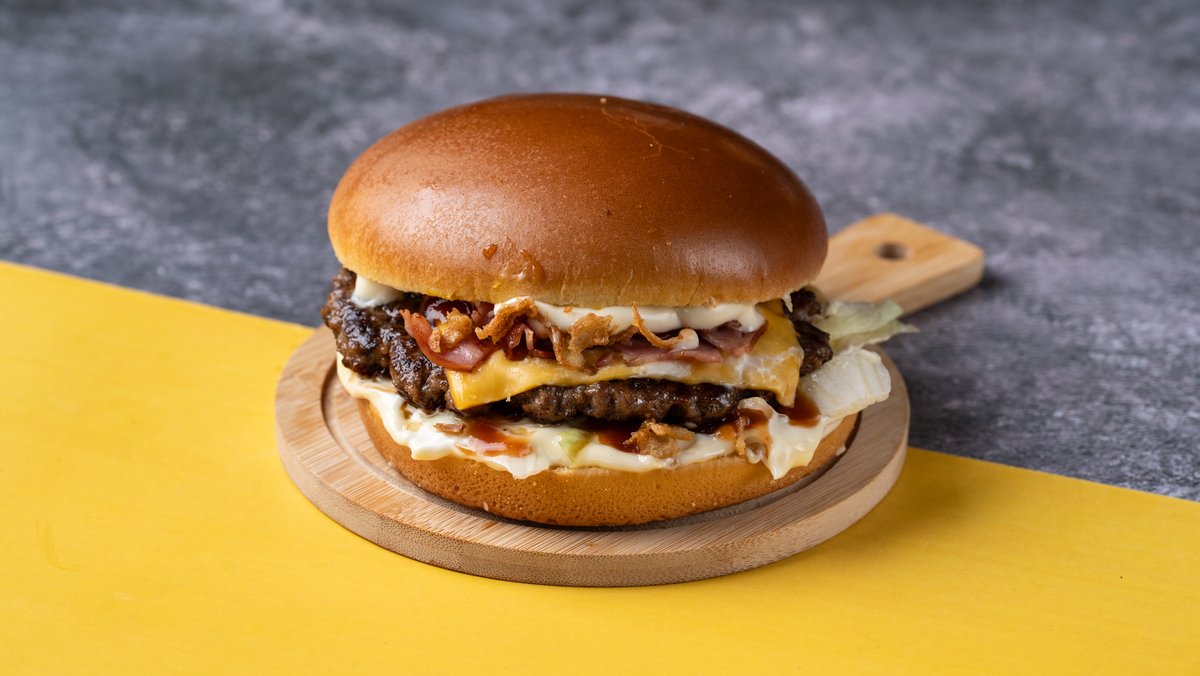 Αφράτο brioche ψωμάκι με 2 smashed burgers, τραγανό iceberg, διπλό cheddar, διπλό μπέικον, jalapenos, μαγιονέζα και sweet chili sauce