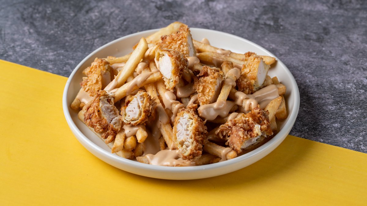 Μερίδα Έξτρα Τραγανές Πατάτες με Κομματάκια Chicken Fillets και Καπνιστή Μαγιονέζα