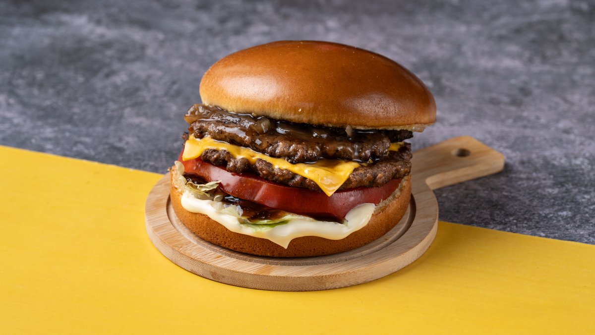 Αφράτο brioche ψωμάκι με 2 smashed burgers, τραγανό iceberg, ντομάτα, cheddar, καραμελωμένα κρεμμύδια, μαγιονέζα και Jack Daniel’s sauce