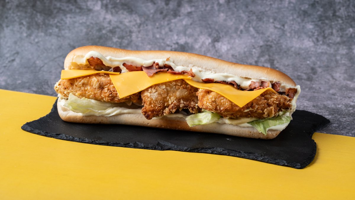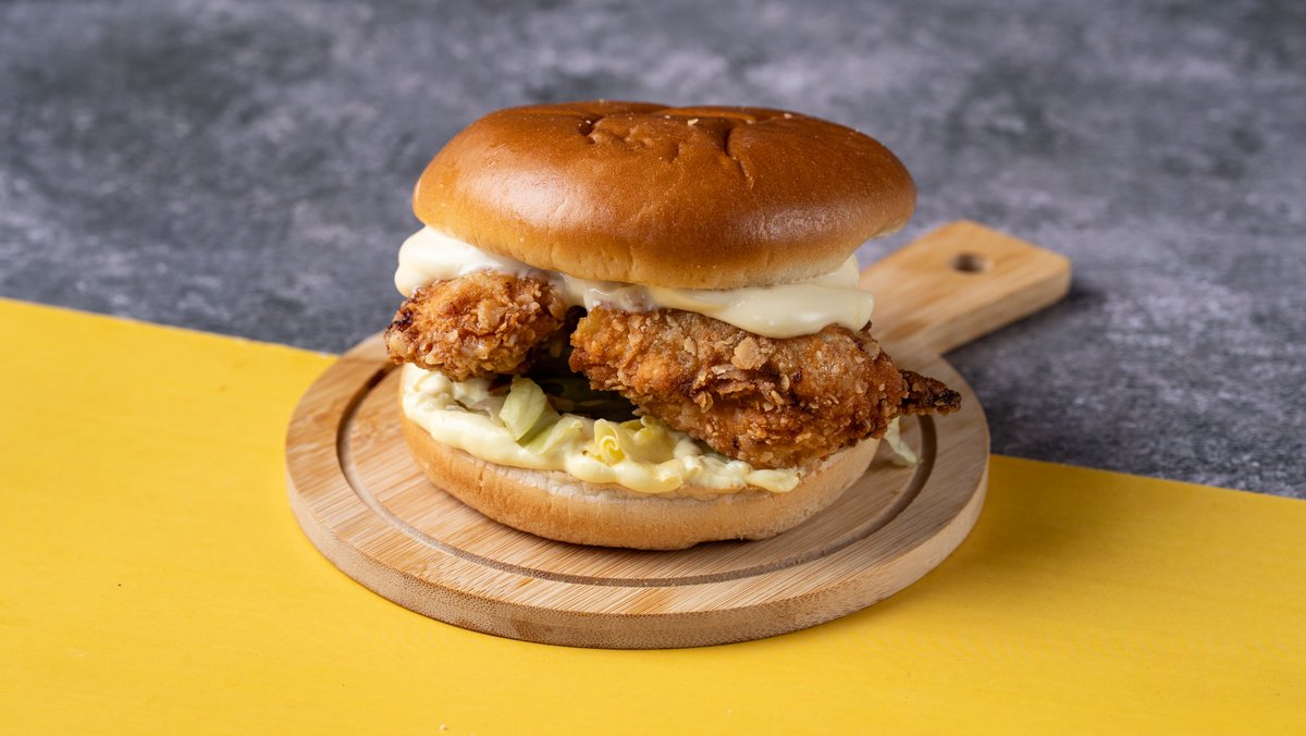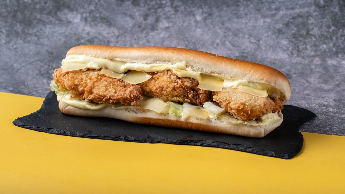Αφράτο ψωμάκι με chicken fillets μαριναρισμένα και παναρισμένα με τη μυστική μας συνταγή, τραγανό iceberg, μαγιονέζα και μουσταρδομαγιονέζα