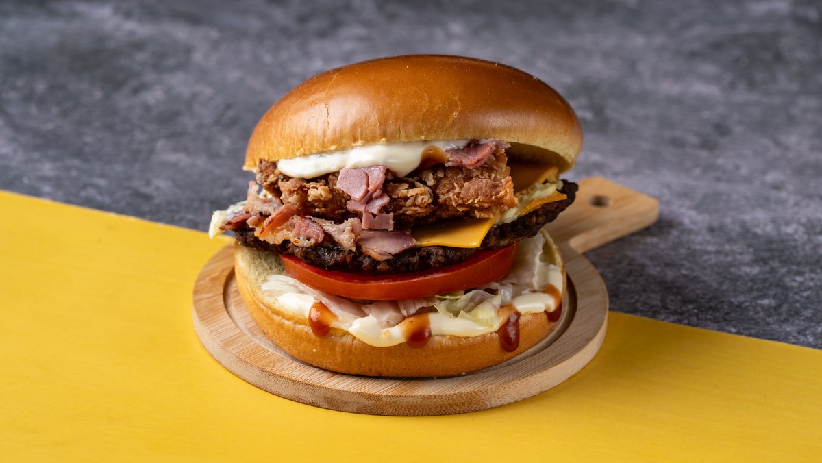 Αφράτο brioche ψωμάκι με ένα smashed burger και 2 chicken fillets μαριναρισμένα και παναρισμένα με τη μυστική μας συνταγή, τραγανό iceberg, ντομάτα, cheddar, μπέικον, μαγιονέζα και ketchup