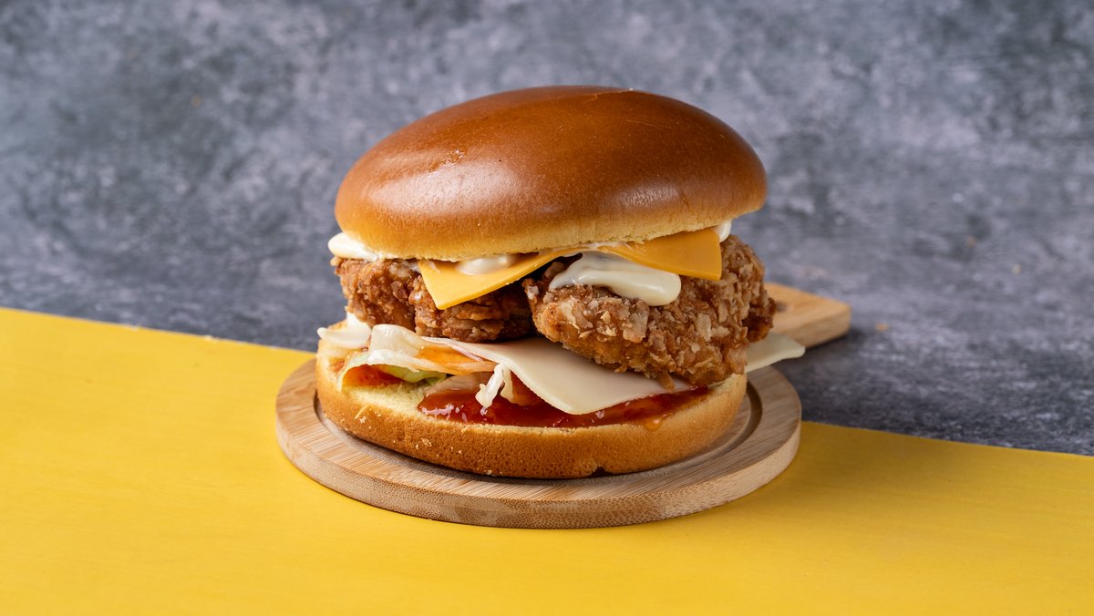 Αφράτο brioche ψωμάκι με 2 chicken fillets μαριναρισμένα και παναρισμένα με τη μυστική μας συνταγή, τραγανό iceberg, gouda, cheddar, μαγιονέζα και sweet chili sauce