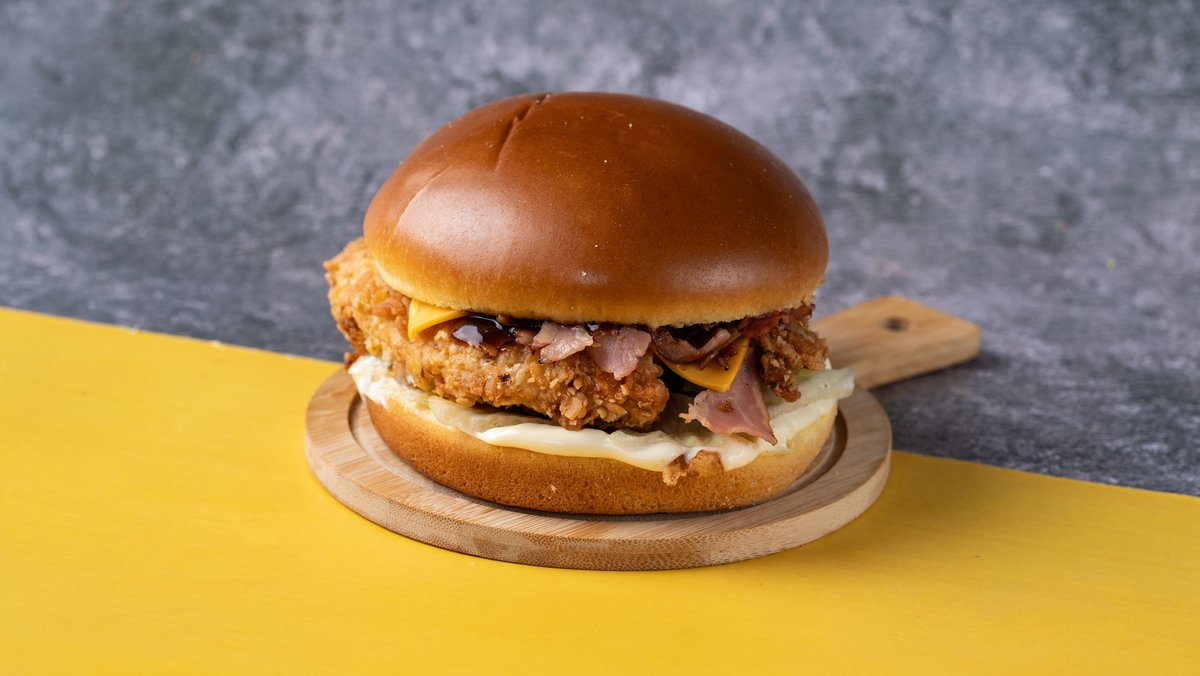 Αφράτο brioche ψωμάκι με 2 chicken fillets μαριναρισμένα και παναρισμένα με τη μυστική μας συνταγή, τραγανό iceberg, cheddar, bacon, flakes κρεμμυδιού, μαγιονέζα και bbq sauce