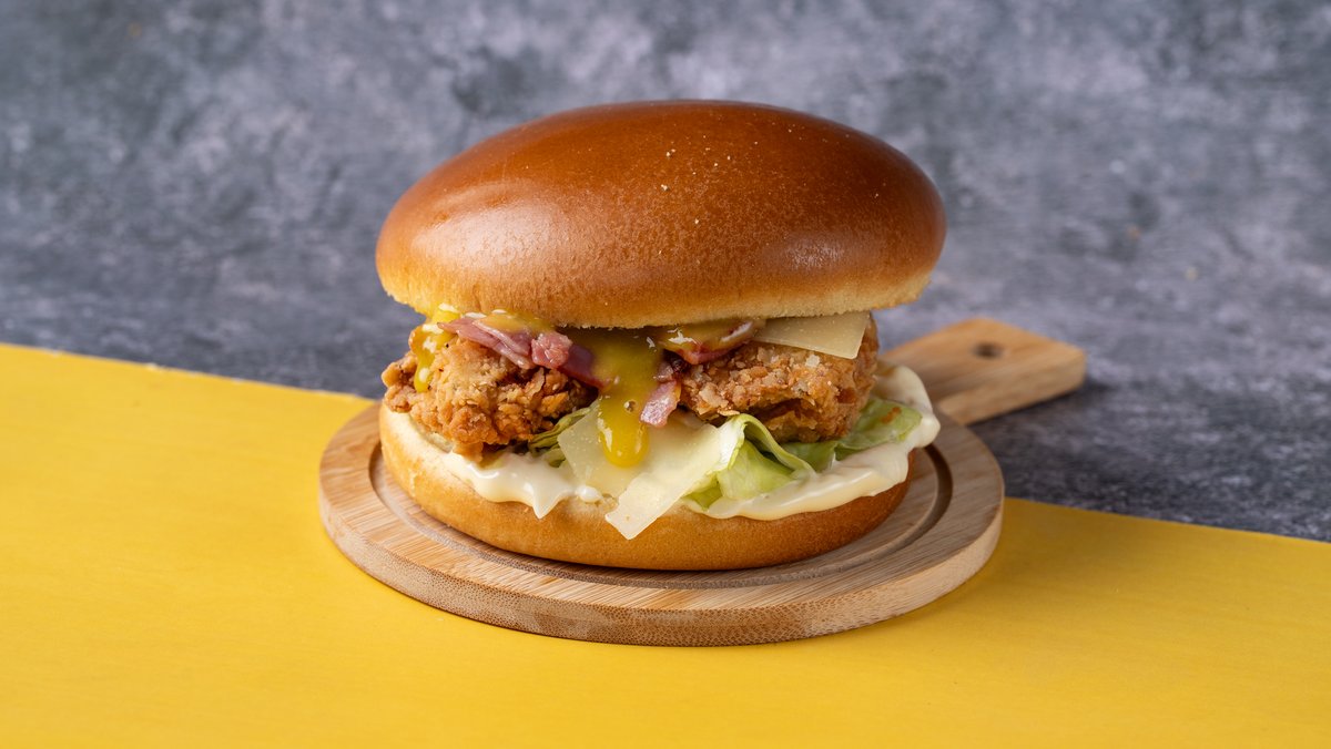Αφράτο brioche ψωμάκι με 2 chicken fillets μαριναρισμένα και παναρισμένα με τη μυστική μας συνταγή, τραγανό iceberg, flakes παρμεζάνας, μπέικον, μαγιονέζα και honey mustard sauce