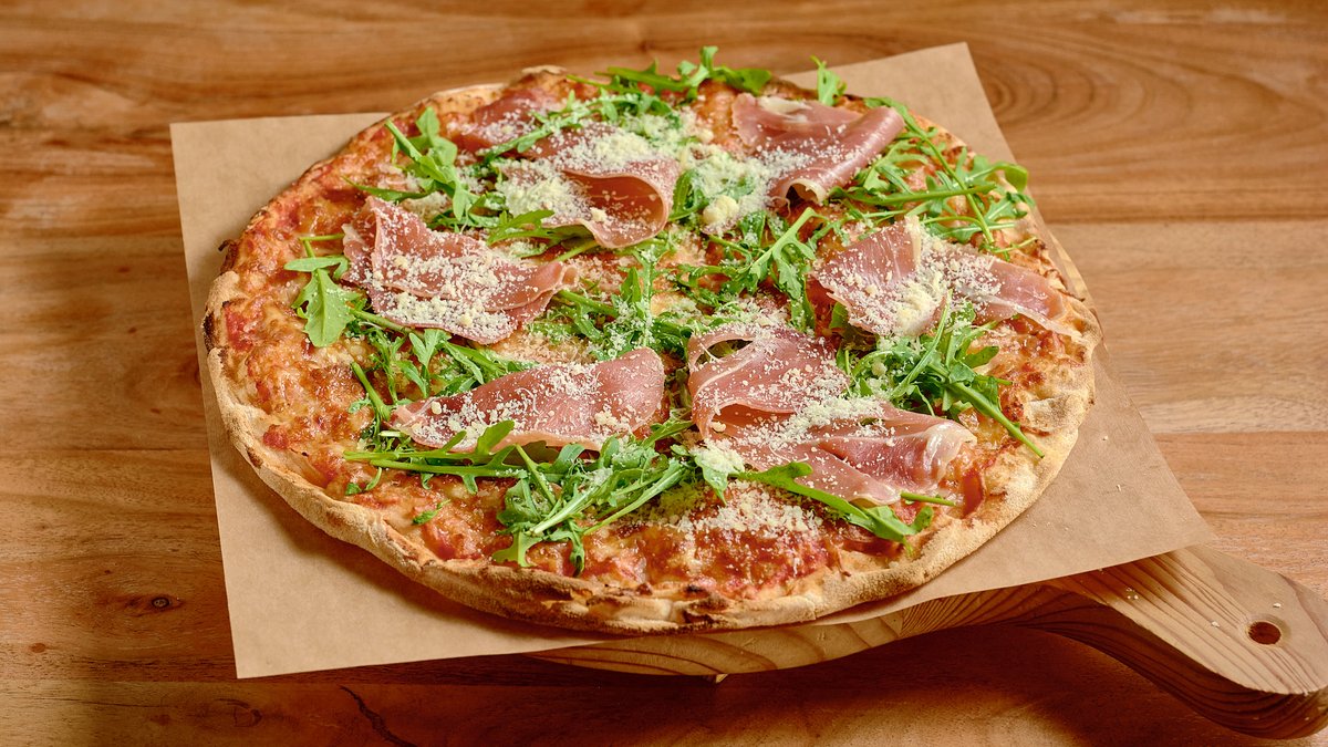Με σάλτσα ντομάτας, mozzarella, παρμεζάνα, προσούτο και ρόκα