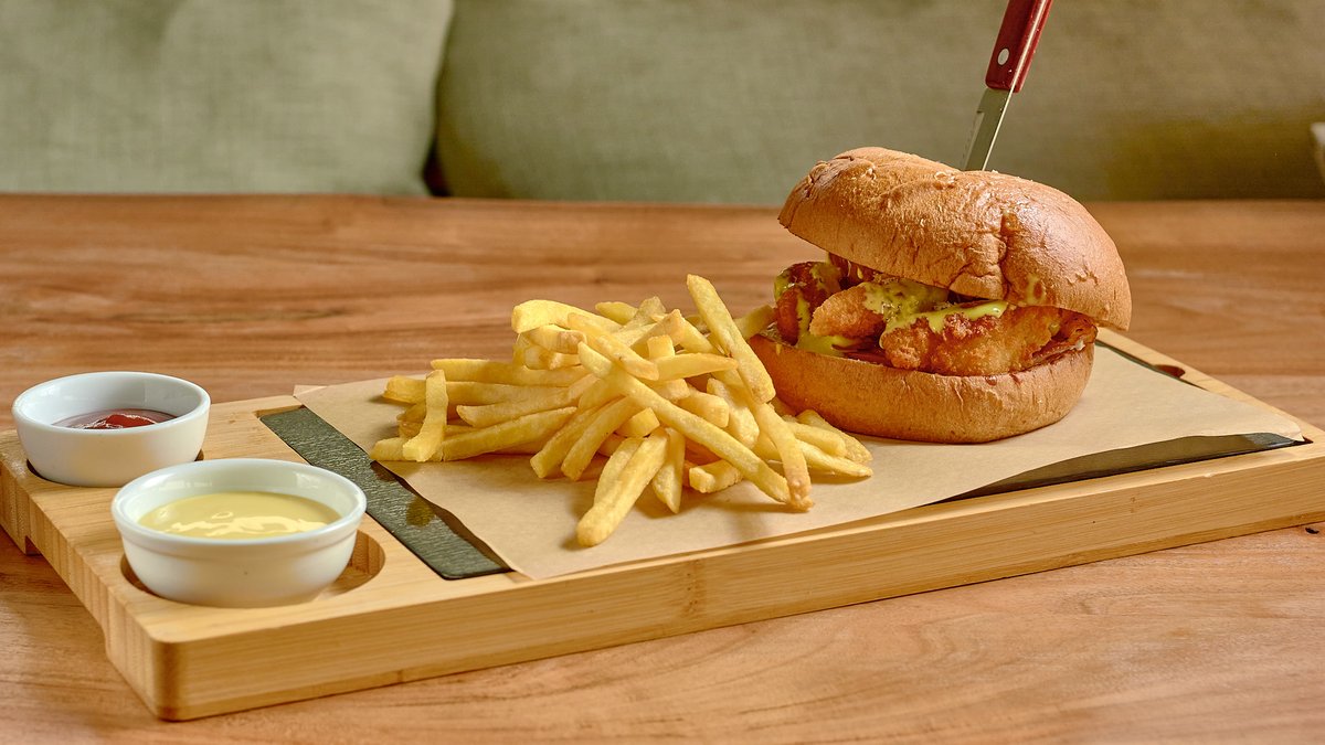 Με μπιφτέκι κοτόπουλο 130g, παρμεζάνα τριμμένη, μπέικον, ντομάτα, τυρί κρέμα και Caesar`s sauce. Συνοδεύεται από πατάτες τηγανητές