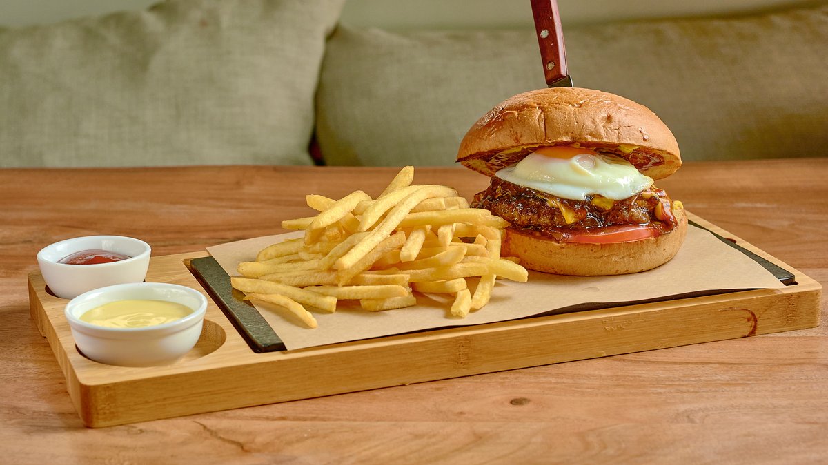Με μπιφτέκι μοσχαρίσιο 130g, cheddar, μπέικον, αυγό τηγανητό, ντομάτα, κρεμμύδι και μαγιονέζα. Συνοδεύεται από γαρνιτούρα της επιλογής σου