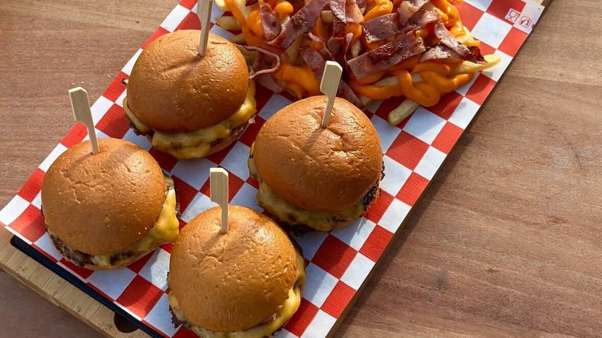 4τμχ με μπιφτέκι, τσένταρ, κέτσαπ, μουστάρδα κ πίκλες. Συνοδεύονται από πατάτες τηγανητές