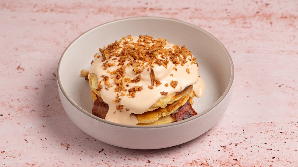 Με μπέικον, τηγανητό αυγό, τυρί, crispy onions, ντομάτα και cocktail sauce