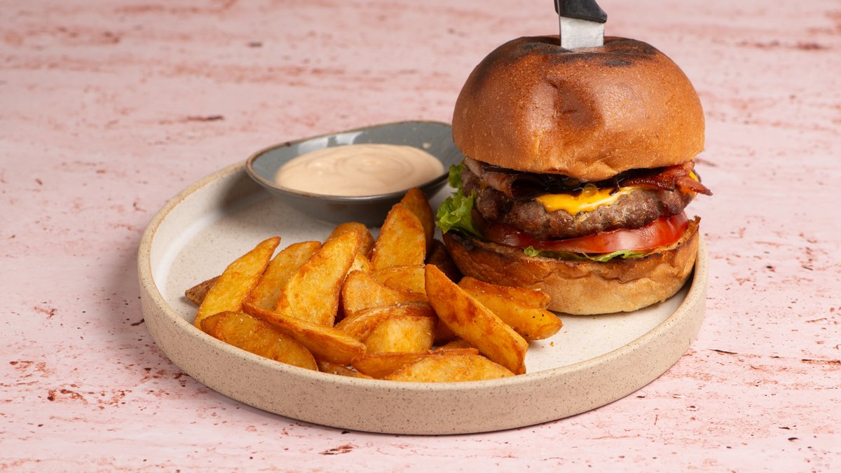 Με μοσχαρίσιο μπιφτέκι 200 g, bacon, cheddar, καραμελωμένο κρεμμύδι και μαγιονέζα τρούφας.Συνοδεύεται από πατάτες country