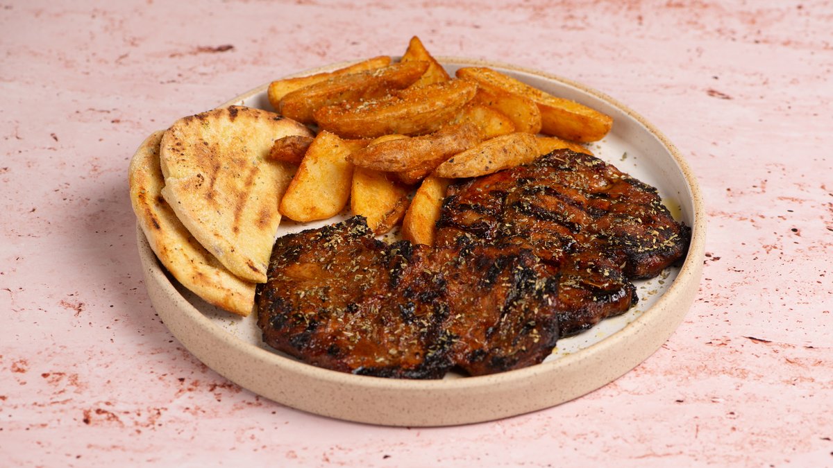 Μαριναρισμένα σε bbq sauce. Συνοδεύονται από πιτάκια και πατάτα baby