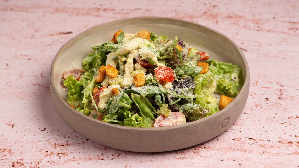 Με mix πράσινης σαλάτας, κοτόπουλο, νροματίνια, grana padano και ceasar's sauce
