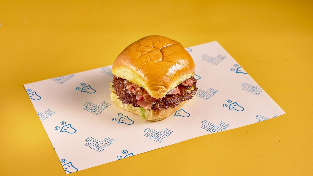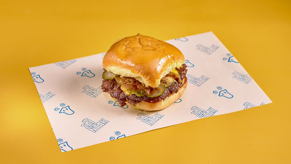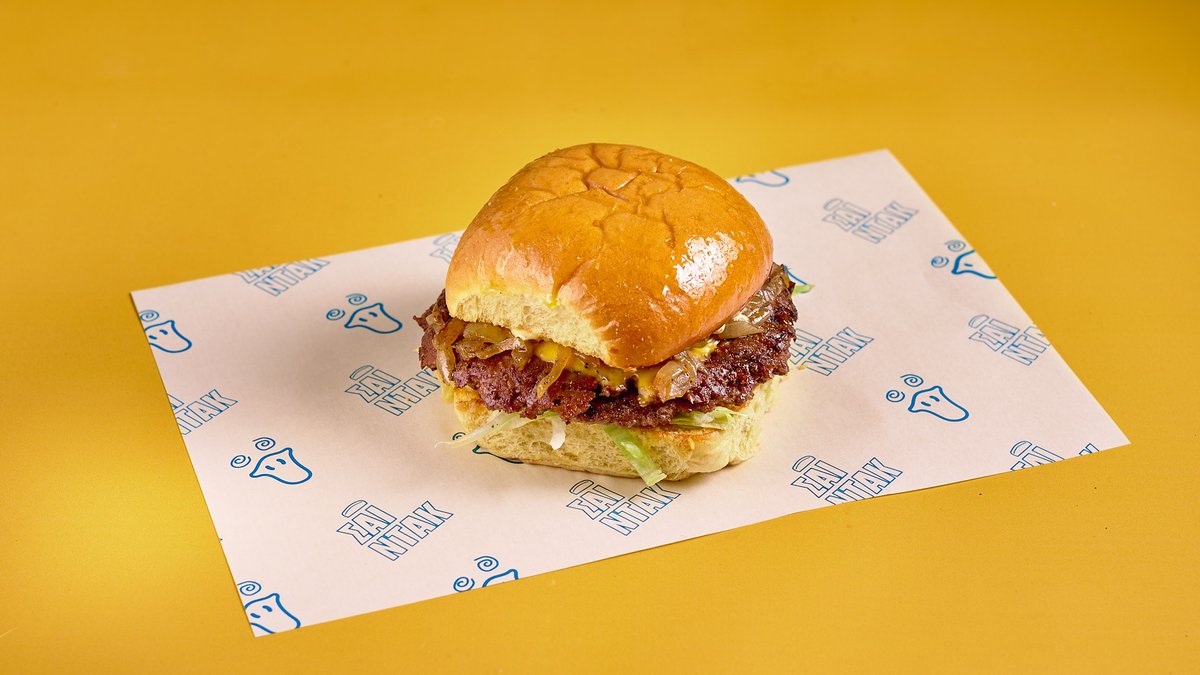Single black angus burger, onion, American cheese, pickled cucumber, ketchup, mustard