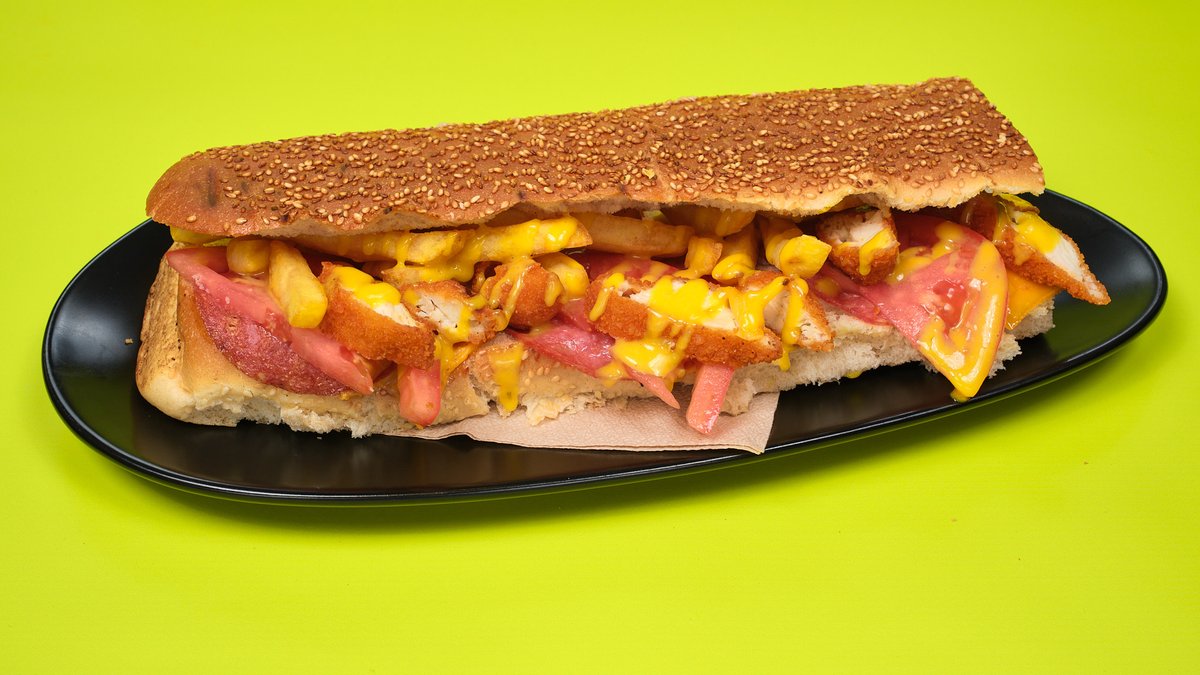 Με ζαμπόν, gouda, μπέικον, ντομάτα, μαρούλι και μαγιονέζα. Συνοδεύεται από πατάτες τηγανητές και dip ketchup