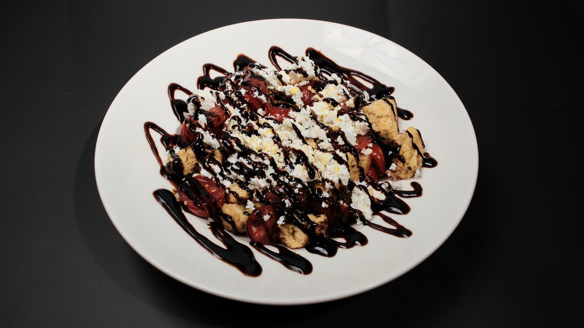 Με ντοματίνια, παξιμάδι, κάπαρη, ανθότυρο, ελιές, βαλσάμικο και έξτρα παρθένο ελαιόλαδο