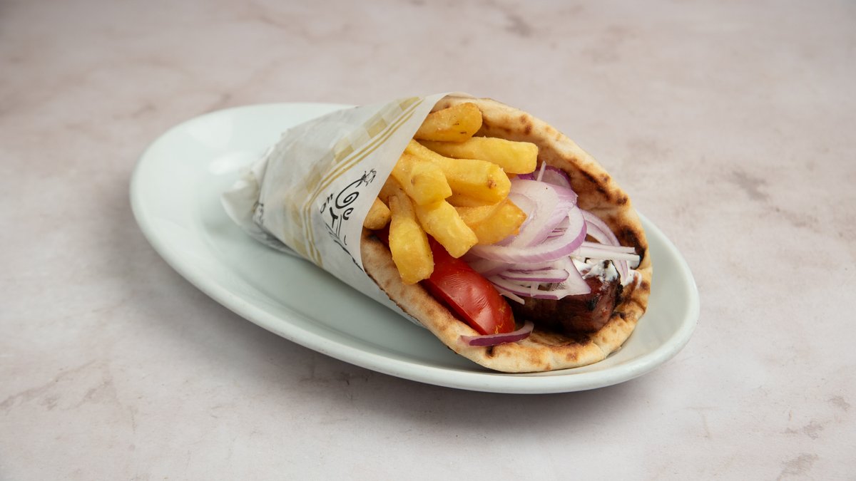 Συνοδεύεται από πατάτες τηγανητές, τζατζίκι, ντομάτα, κρεμμύδι και πίτα