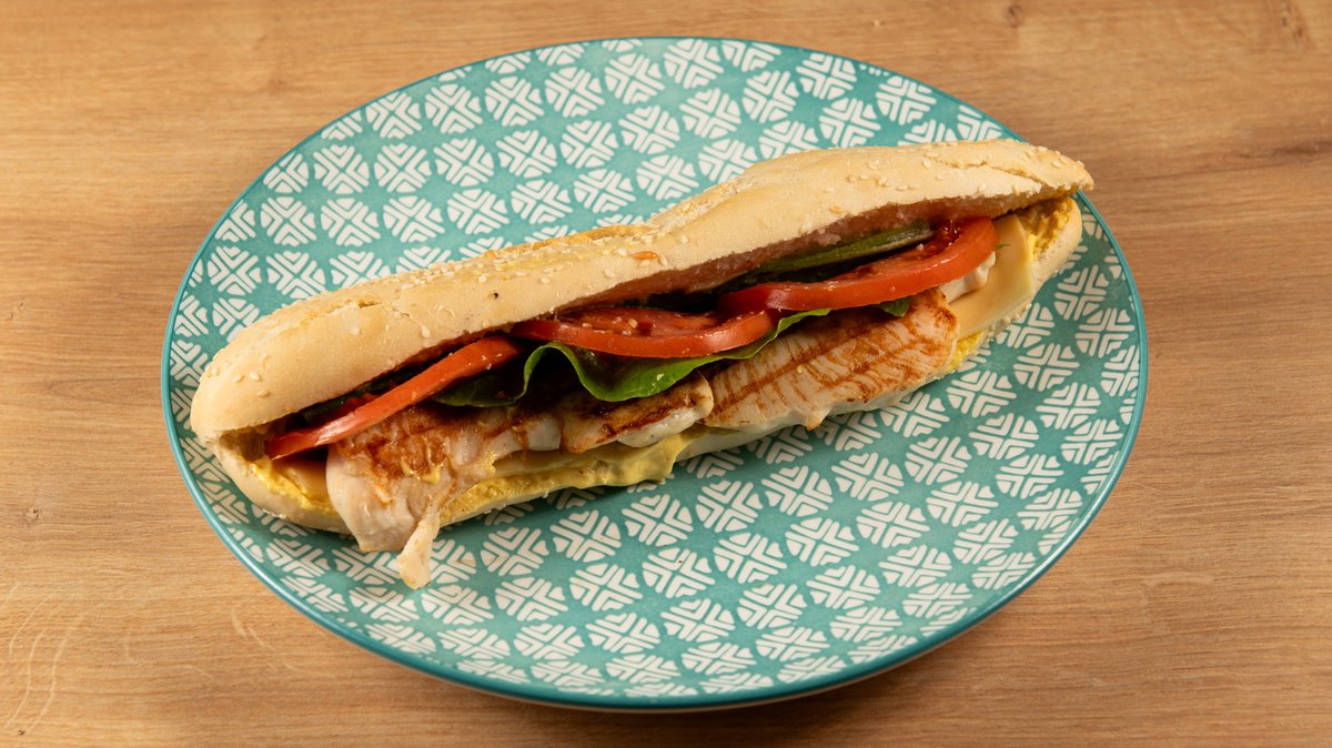 Με κοτόπουλο φιλέτο, gouda, μπέικον, ντομάτα, μαρούλι και μαγιονέζα. Συνοδεύεται από πατατάκια
