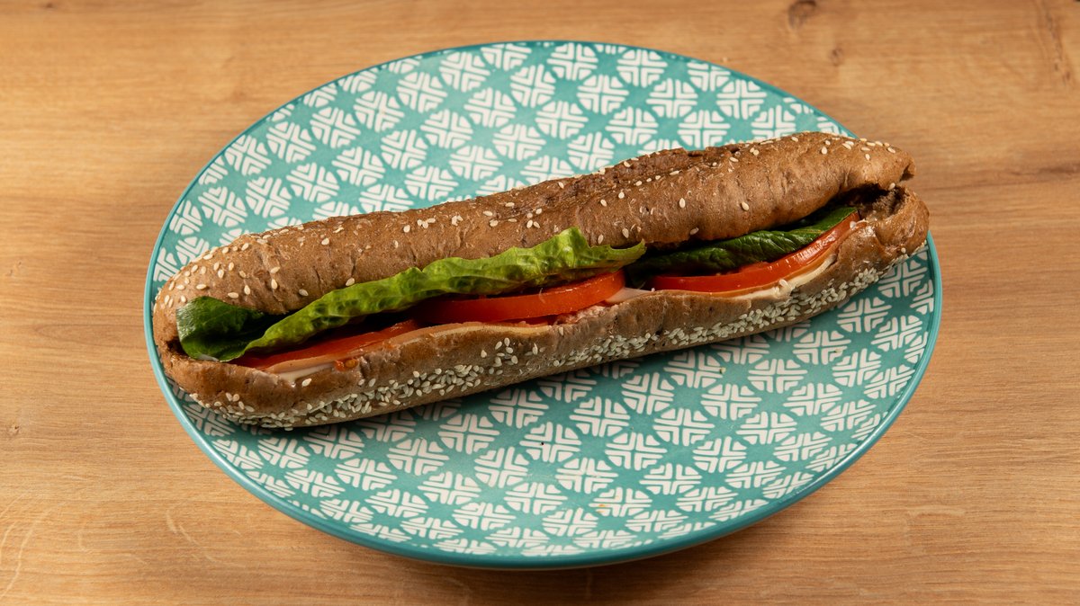 Με γαλοπούλα, gouda, ντομάτα, μαρούλι και μαγιονέζα light. Συνοδεύεται από πατατάκια