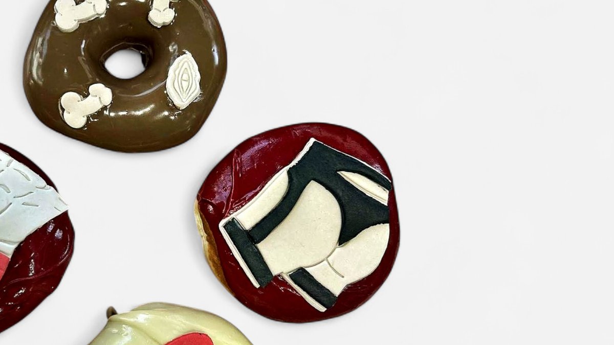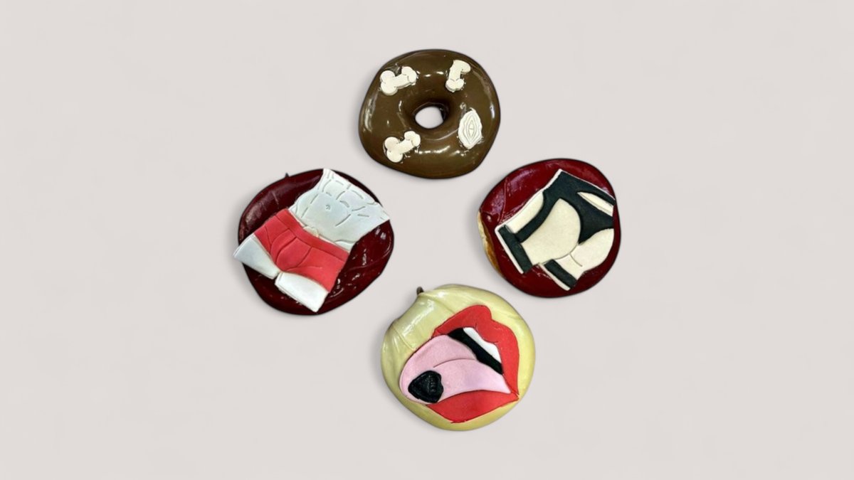 Donut με γέμιση σοκολάτα , επικάλυψη red velvet και topping γυναικείο σώμα από ζαχαρόπαστα