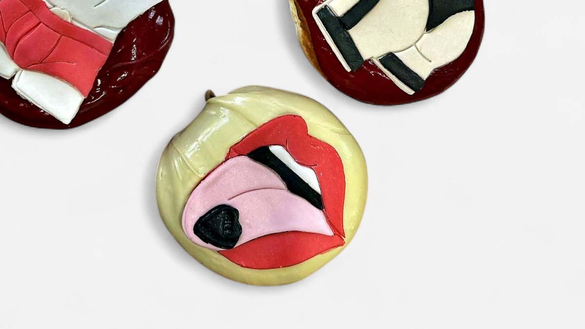 Donut με γέμιση σοκολάτα , επικάλυψη λευκή σοκολάτας και topping χείλια από ζαχαρόπαστα