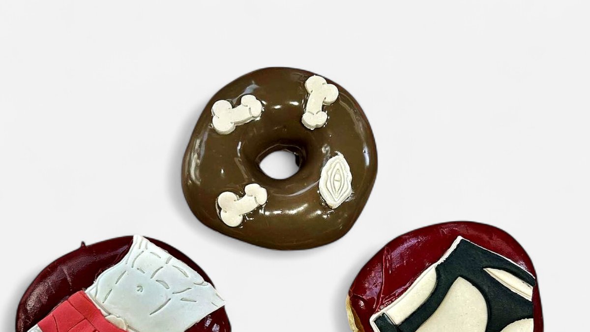 ντονατ με γεμιση σοκολατα επικαλυψη λευκης και topping bbq themed ζαχαροπαστα