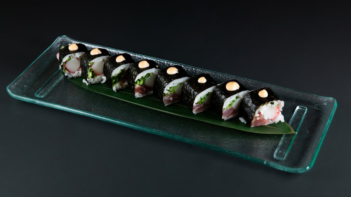 6τεμάχια μικρό ρολό με πίκλα καρότο,spicy mayo,φύλλο sisho,ταρτάρ τόνου, tempura crumbs