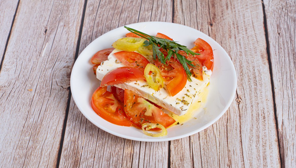 Σαλάτα με ντομάτα, αγγούρι, κρεμμύδι, ελιές και φέτα. Συνοδεύεται απο ψωμί