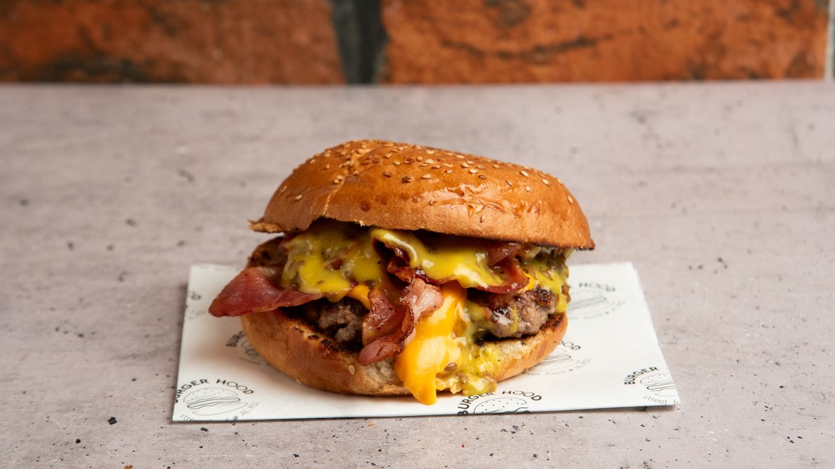 Με 100% μοσχαρίσιο διπλό μπιφτέκι 220g, μπέικον, καραμελωμένα κρεμμύδια, ντομάτα, κρέμα cheddar, μαγιονέζα και honey mustard sauce
