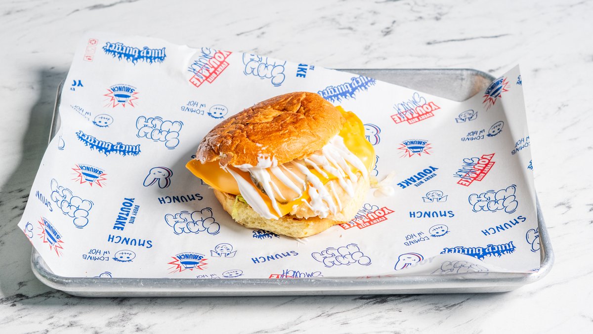 Juicy Smunch Burger 80g, melted cheddar, handmade pickle, ketchup and smunch sauce.