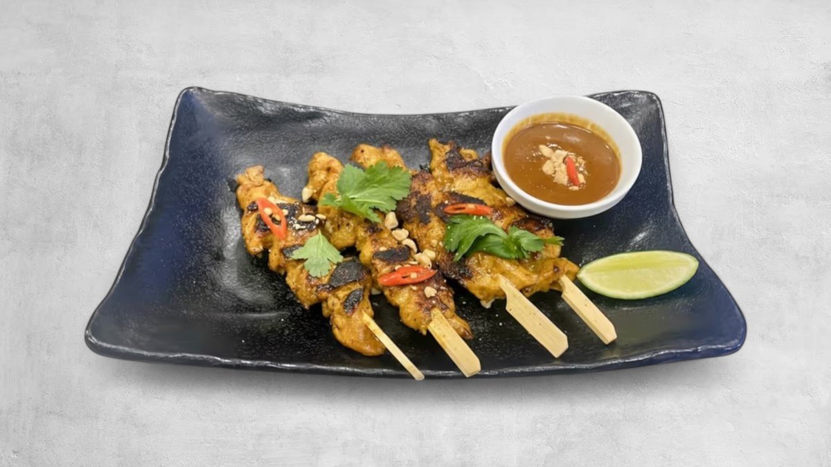 Pileći ražnjići, blago pikantni i posluženi uz kremasti umak od kikirikija i kokosovog mlijeka.