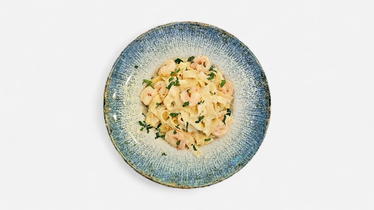 Sočni škampi u kremastom umaku, posluženi na mekanim fettuccinama.