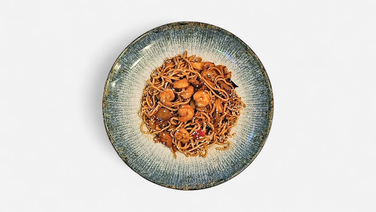 Škampi u woku s povrćem, sezamom i azijskim umakom uz noodles