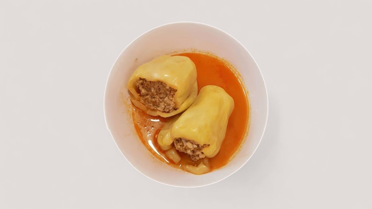 Dvije sočne punjene paprike s mesom i rižom, uz toplu lepinju i pire krumpir