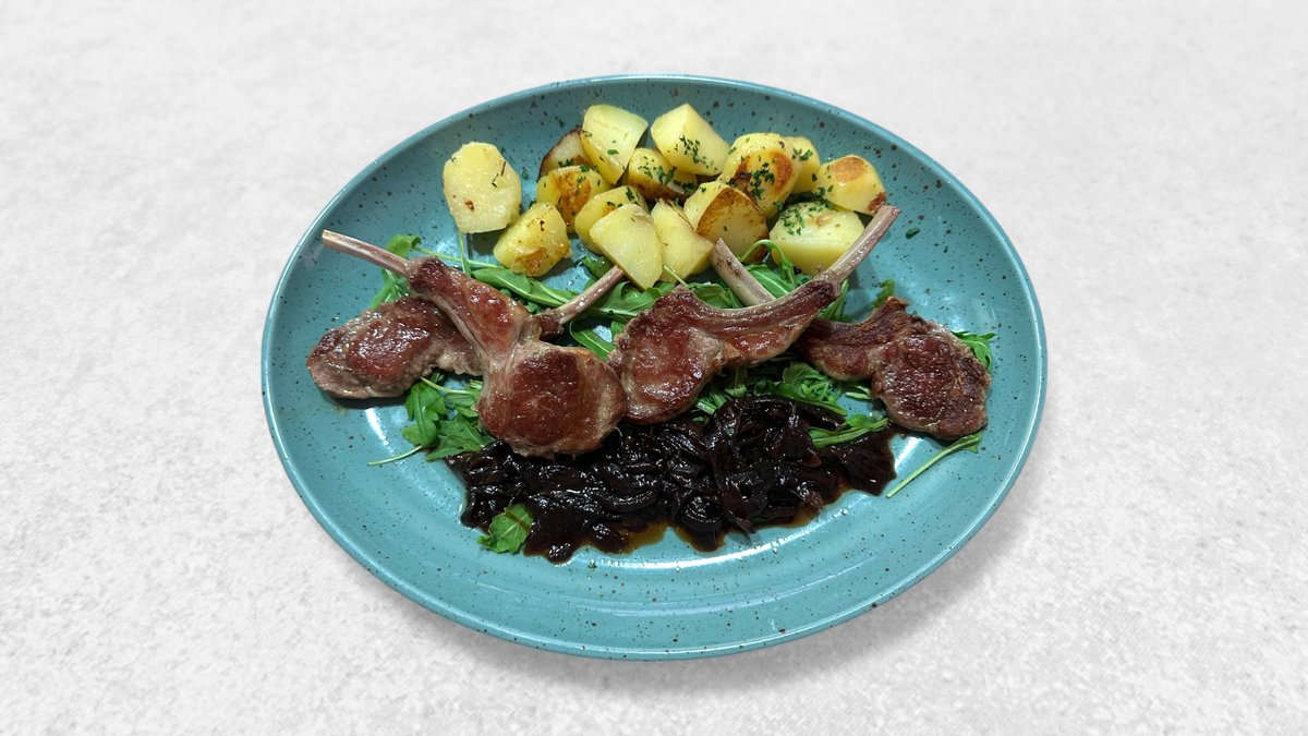 Janjeći kotleti, na kremi od krumpira, umakom, prženom rukolom, i hrskavim lukom