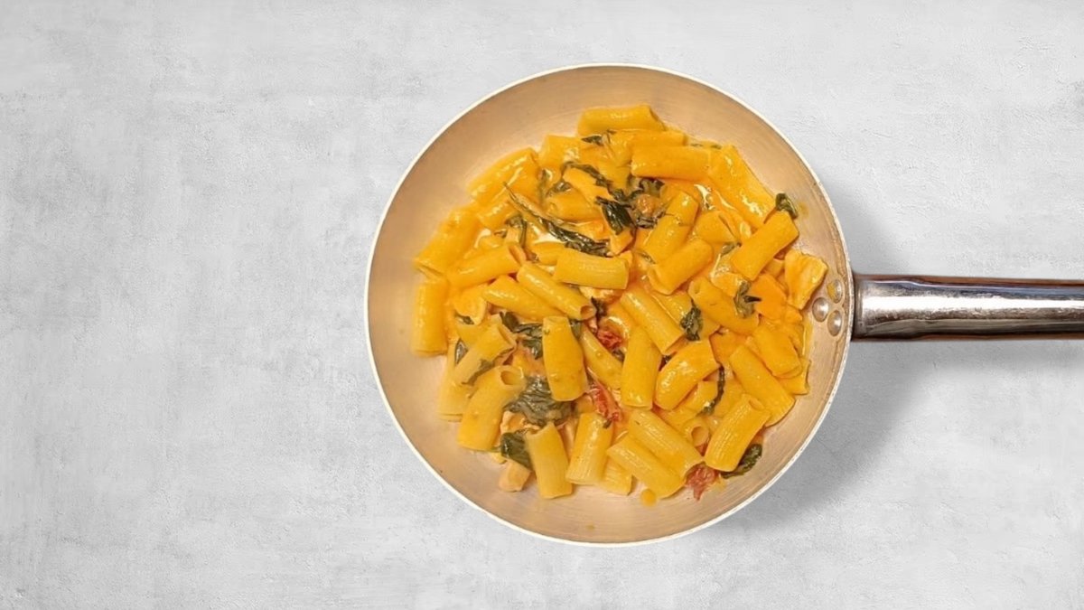 Rigatoni sa piletinom u umaku na bijelo, špinat, suha rajčica i grana padano
