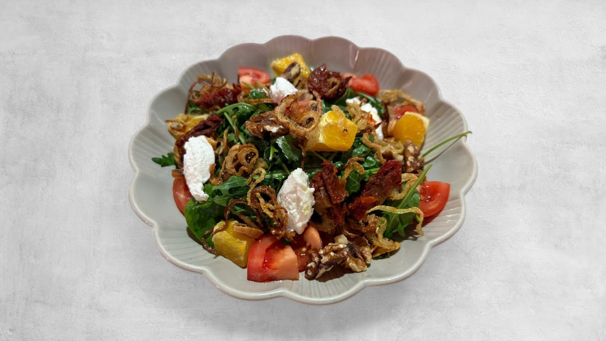 Rukola, špinat, rajčica, skuta, suha rajčica, orah, suha smokva, naranča i hrskavi luk