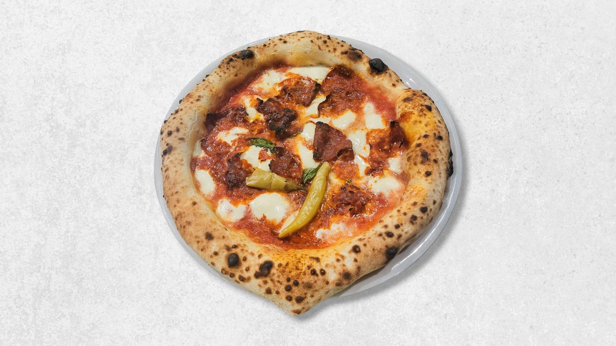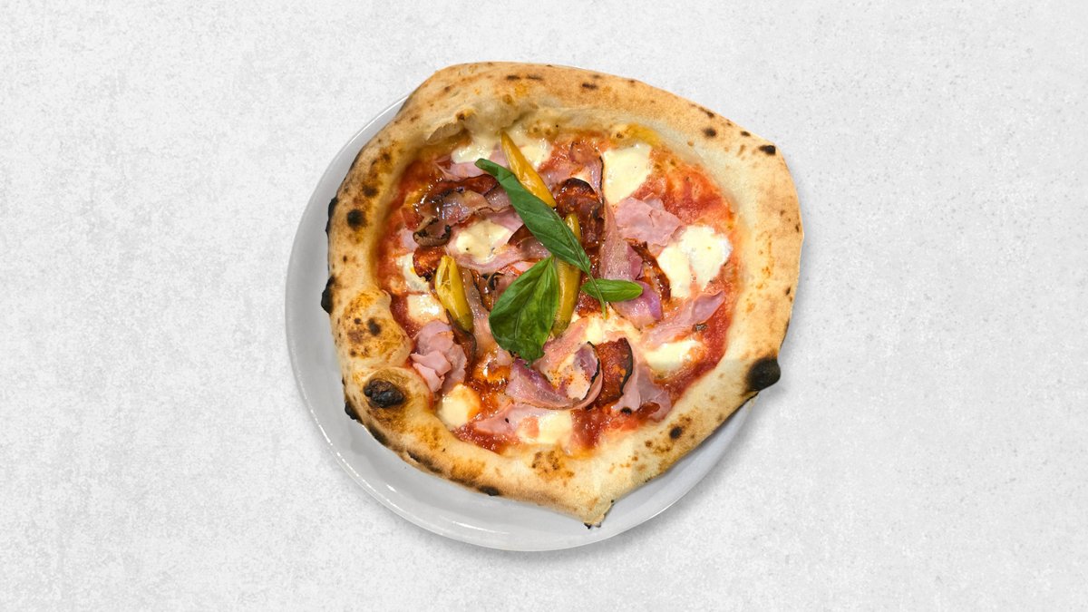 Rajčica San Marzano, mozzarella fior di latte, prosciutto cotto, pikantna salama, panceta, feferoni, bosiljak, ekstra djevičansko maslinovo ulje