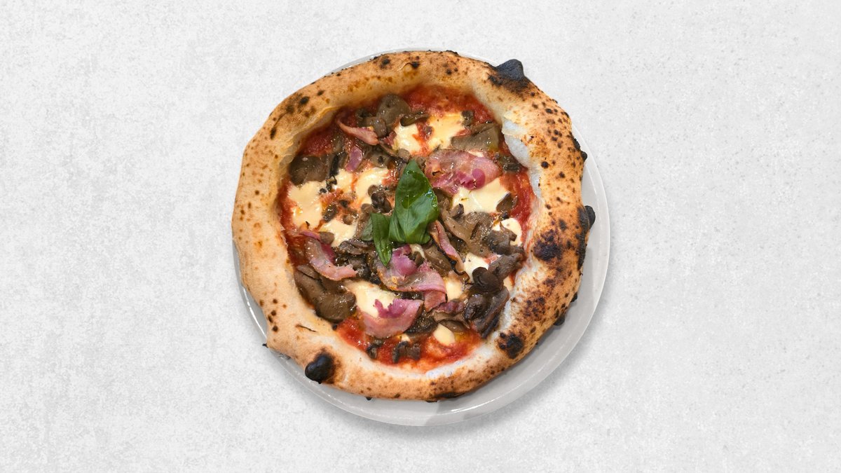 Rajčica San Marzano, mozzarella fior di latte, panceta, marinirane gljive, češnjak, bosiljak, ekstra djevičansko maslinovo ulje