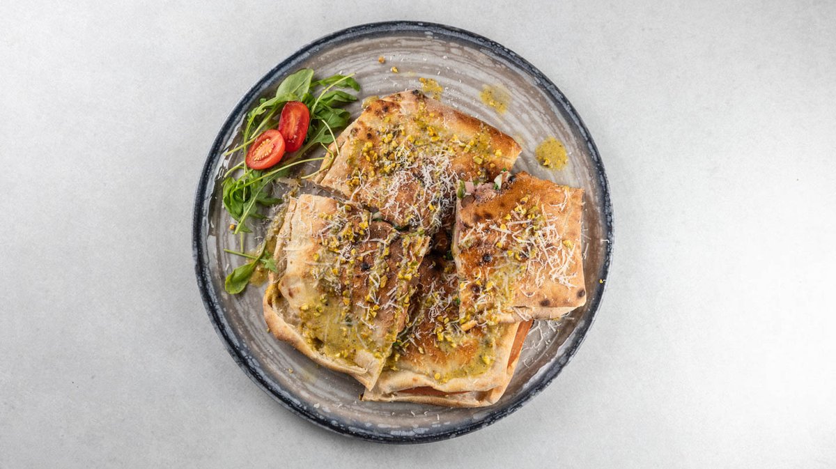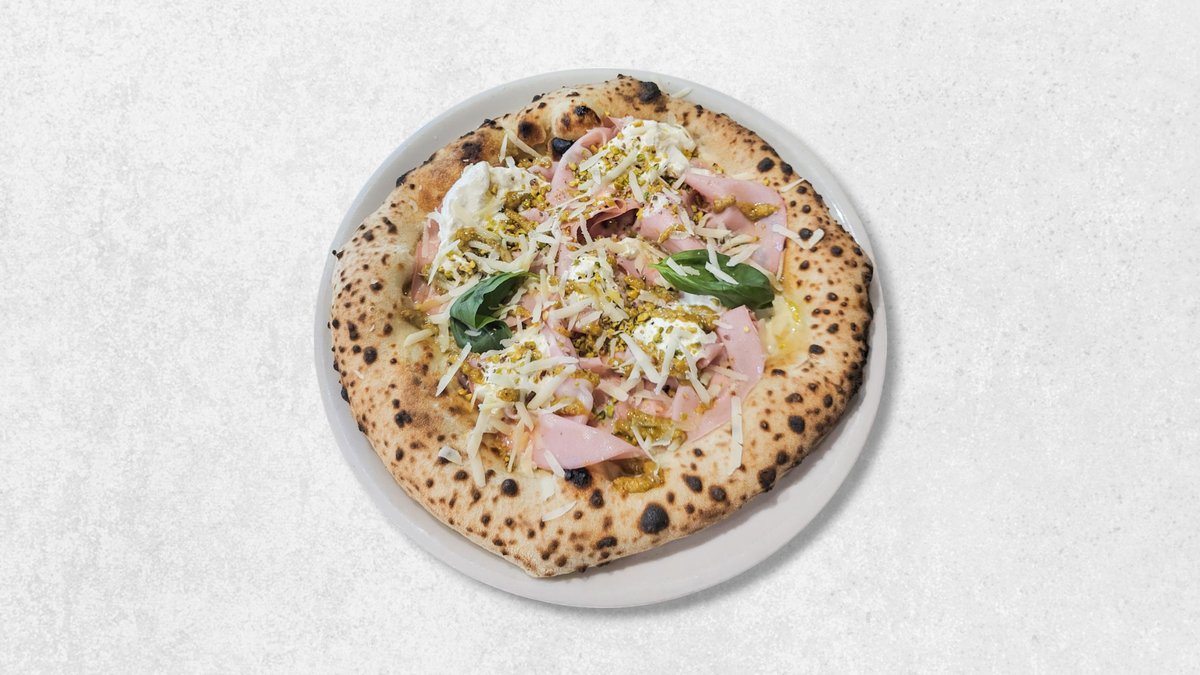 Mozzarella fior di latte, mortadela, stracciatella, krema od pistacija, parmezan, pistacio, bosiljak, ekstra djevičansko maslinovo ulje