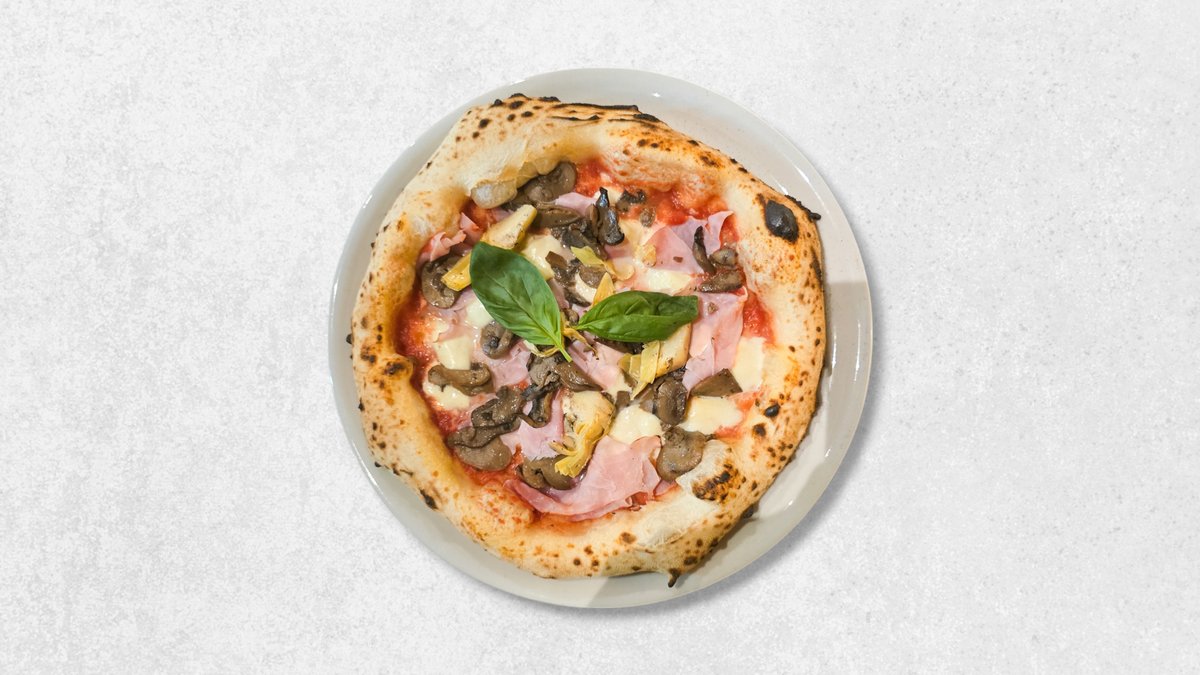 Rajčica San Marzano, mozzarella fior di latte, prosciutto cotto, artičoke, marinirane gljive, bosiljak, ekstra djevičansko maslinovo ulje