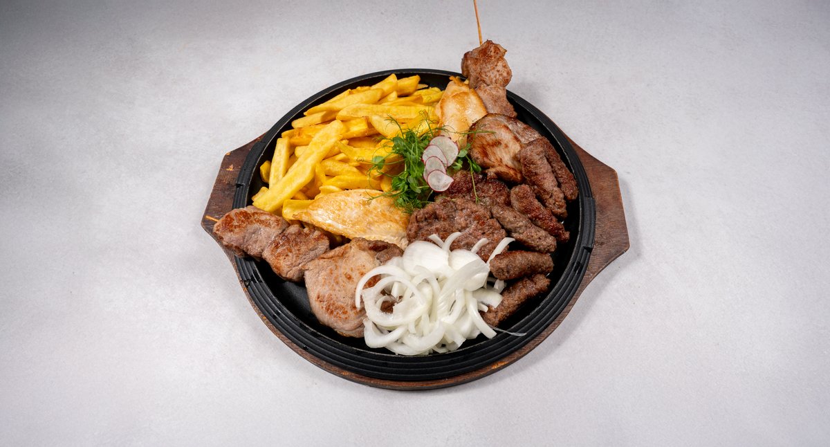 6x ćevapi, 2x ombolo, 2x piletina, 2x ražnjić, 2x pljeskavica. pommes frites, ajvar, porcija za dvije osobe